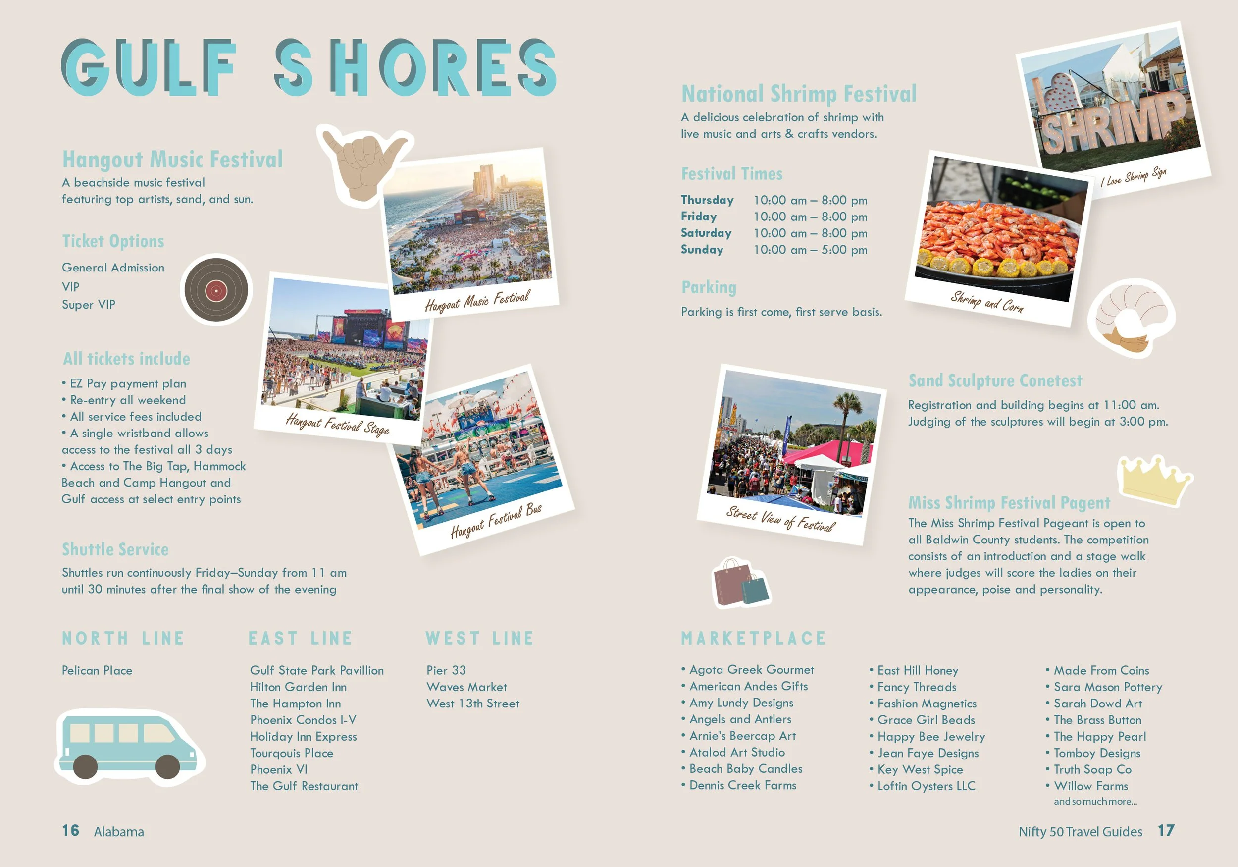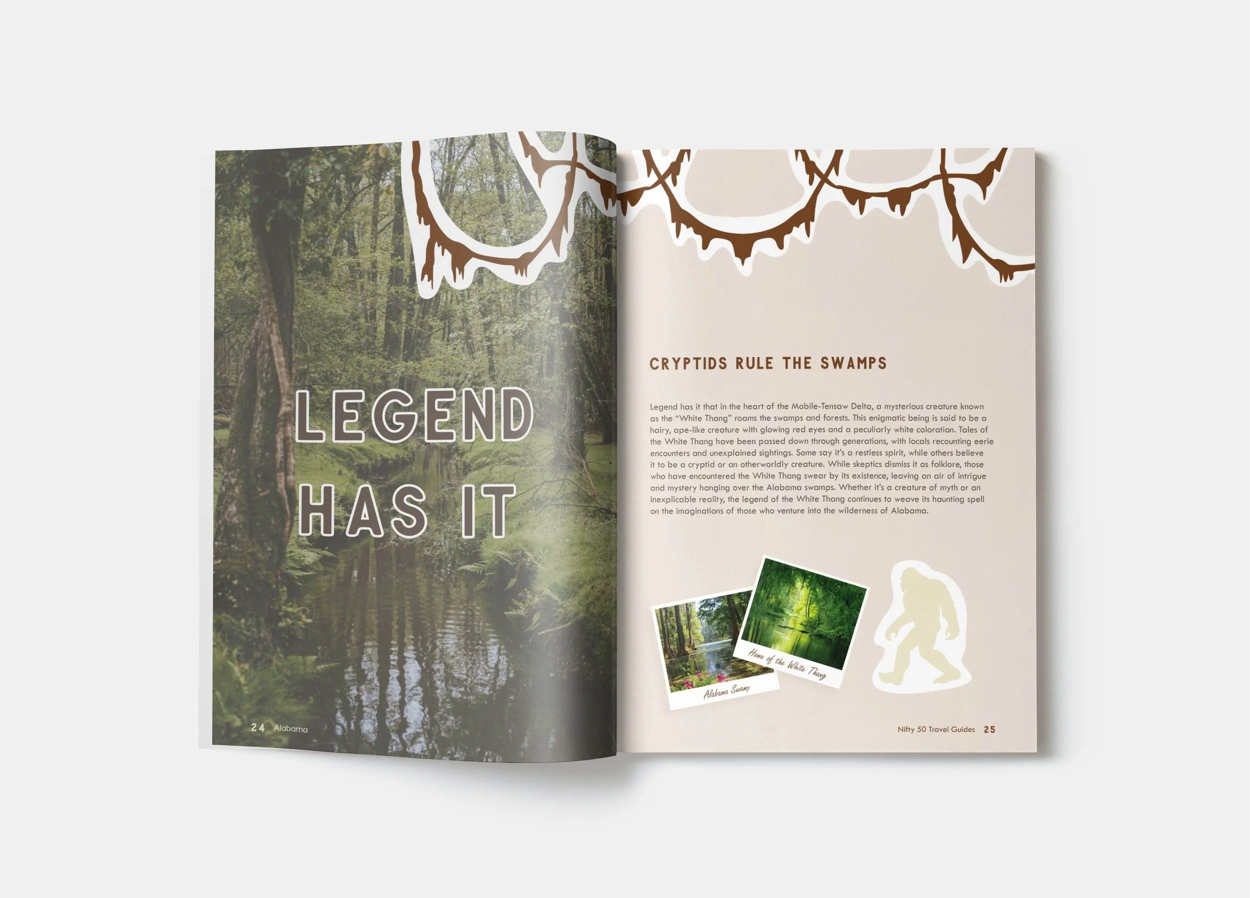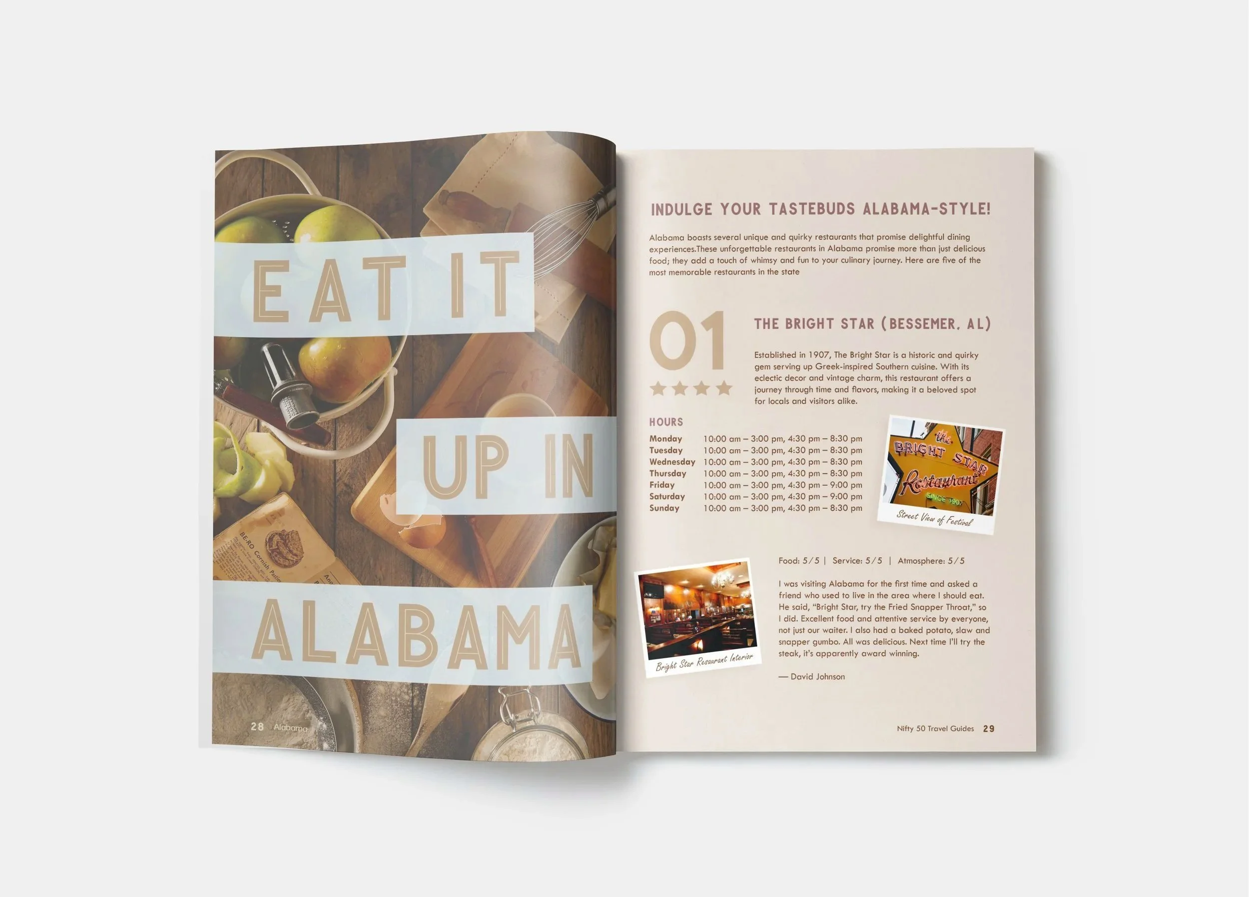 Many traditional travel guides tend to be highly factual but lack visual excitement or personality. My goal was to create a guide that captured the playful tone of the copy while reflecting my own experience of Alabama as lighthearted, welcoming, and fun. To achieve this, I designed the guide in a scrapbook-style format, incorporating Polaroid-inspired imagery and sticker elements throughout the pages.