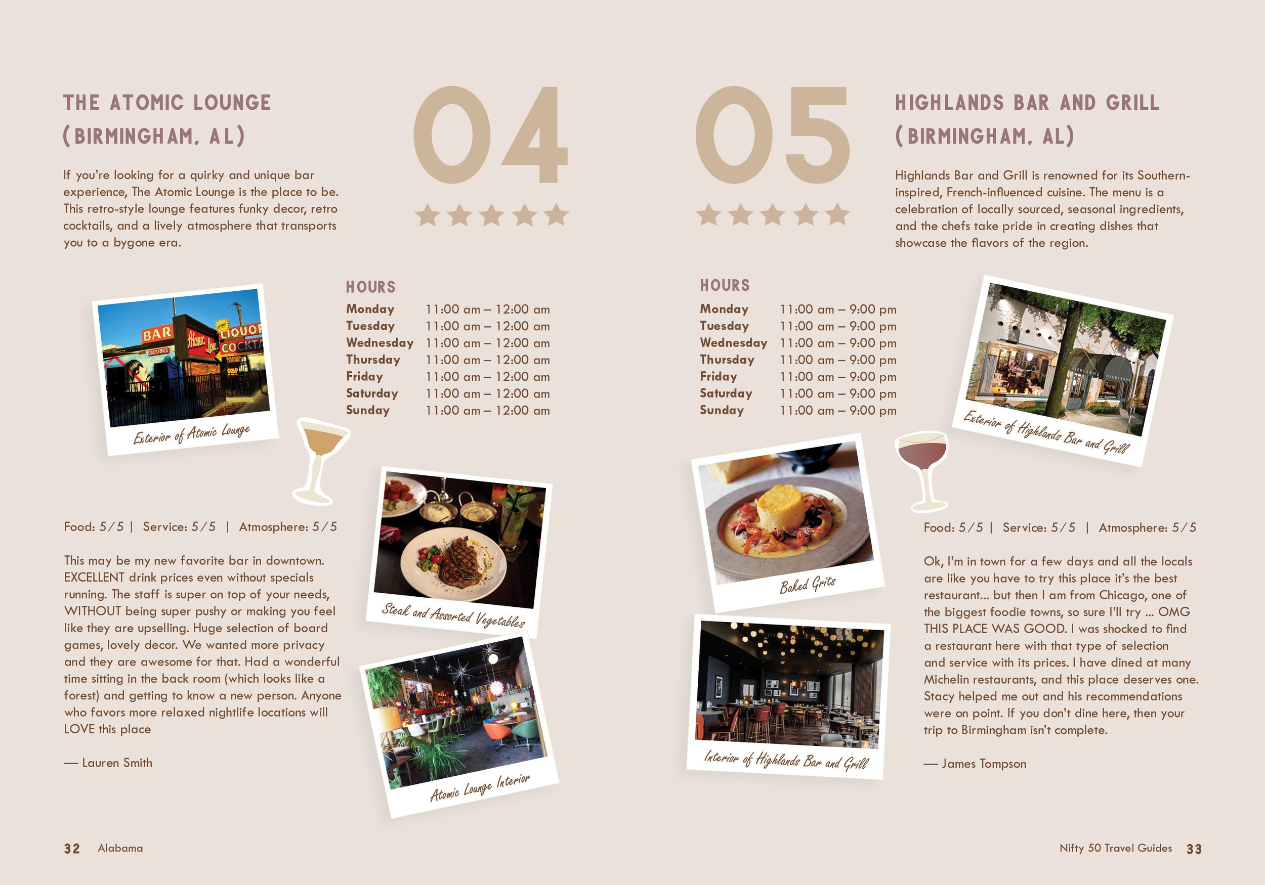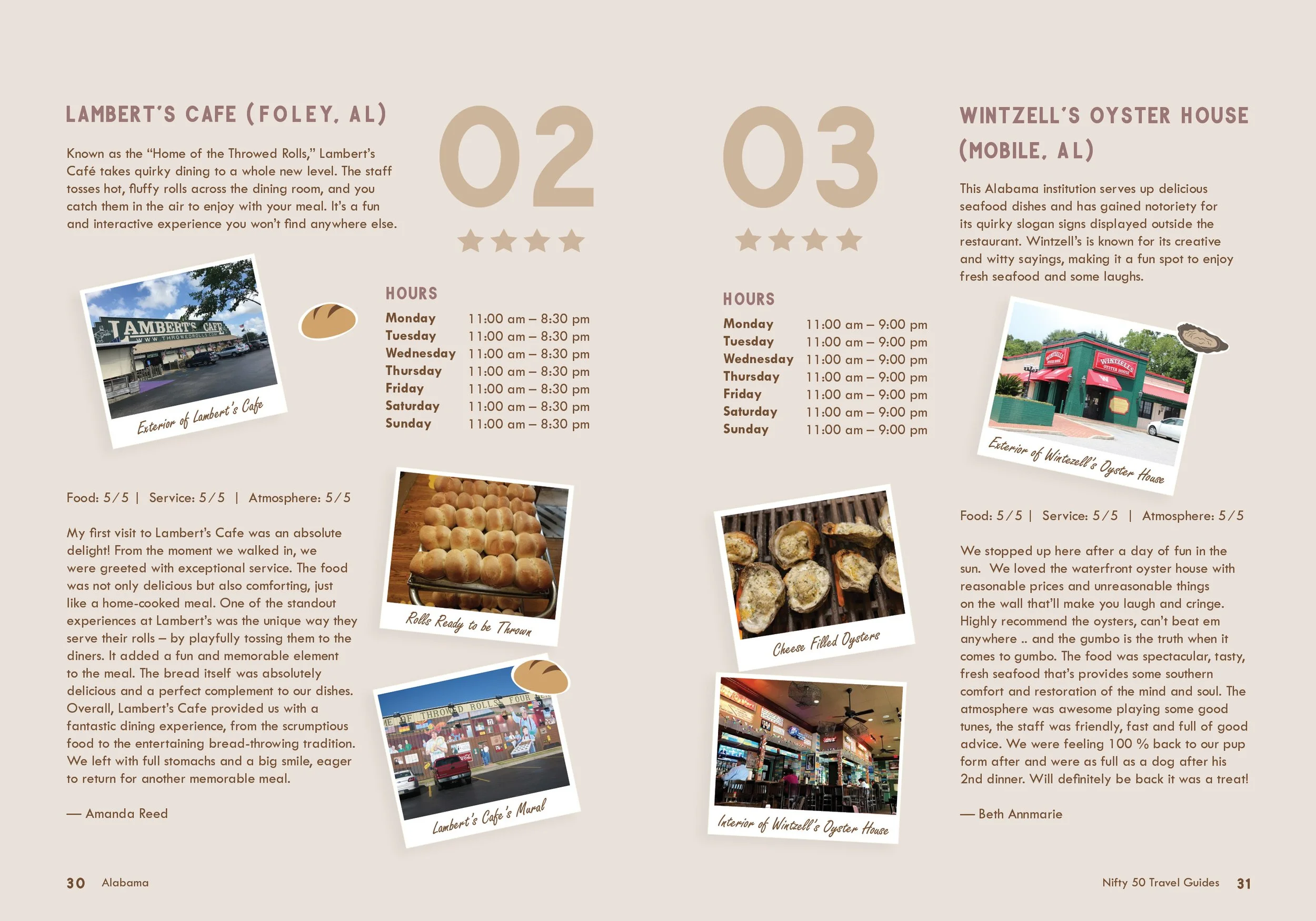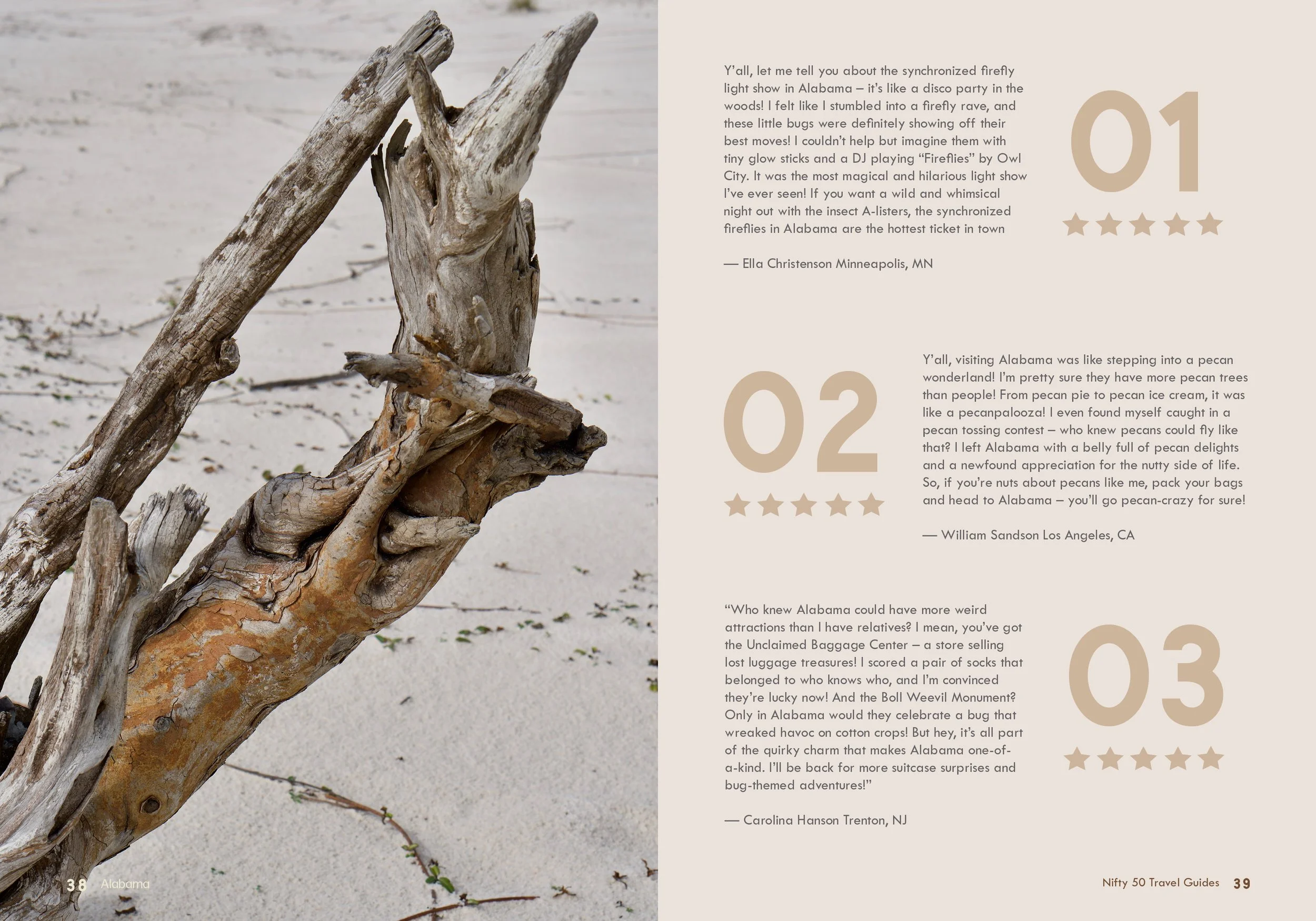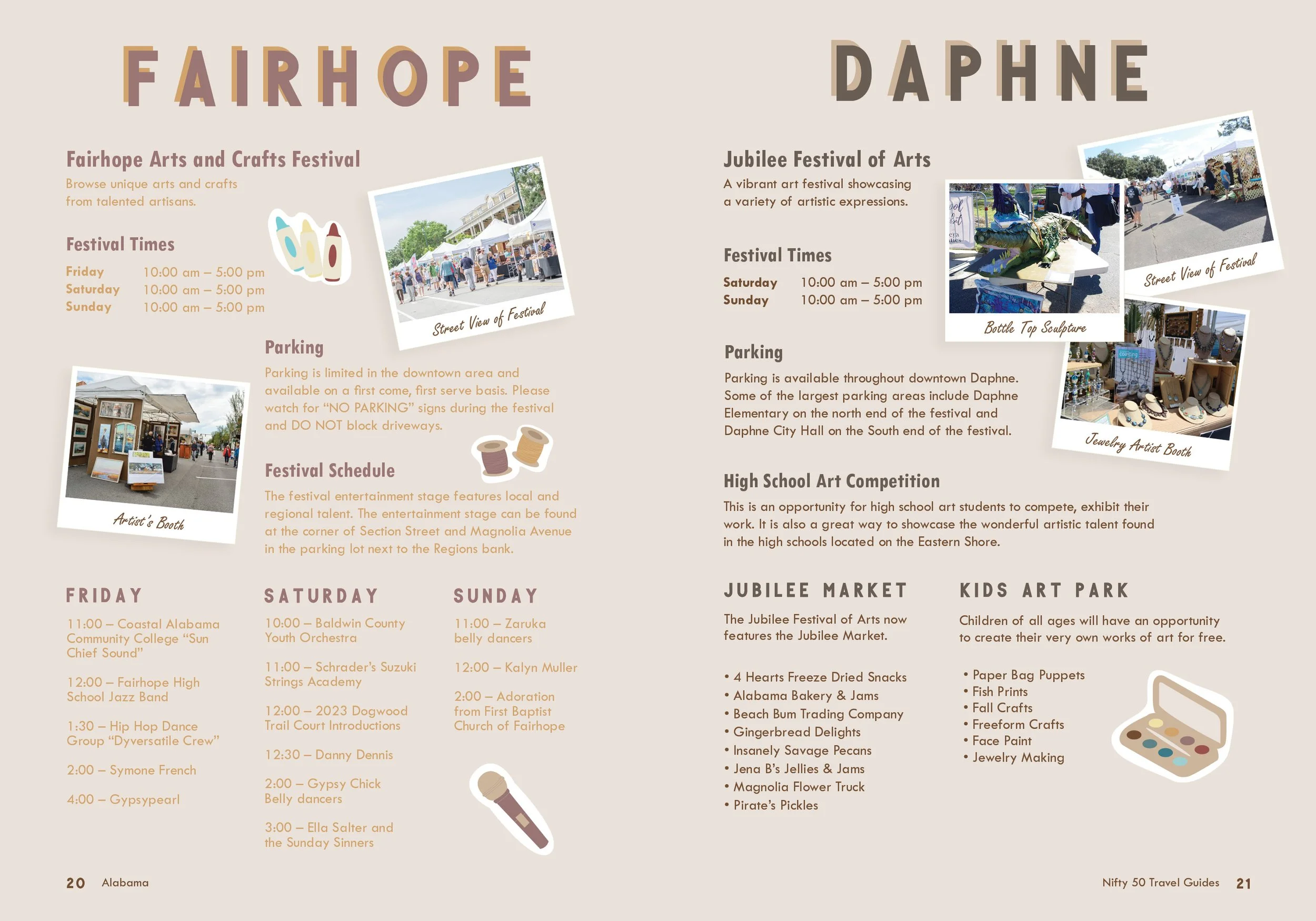 Many traditional travel guides tend to be highly factual but lack visual excitement or personality. My goal was to create a guide that captured the playful tone of the copy while reflecting my own experience of Alabama as lighthearted, welcoming, and fun. To achieve this, I designed the guide in a scrapbook-style format, incorporating Polaroid-inspired imagery and sticker elements throughout the pages.