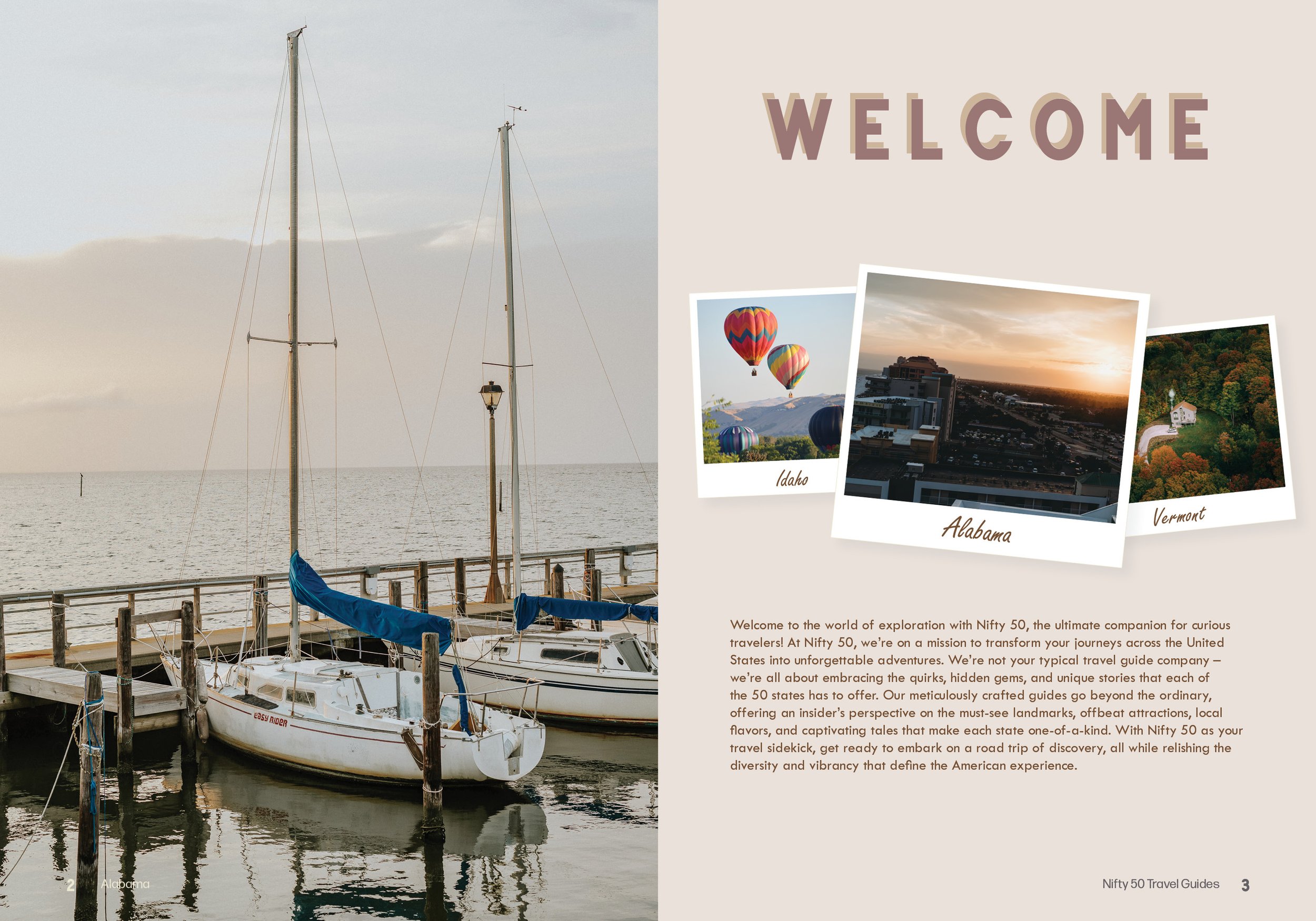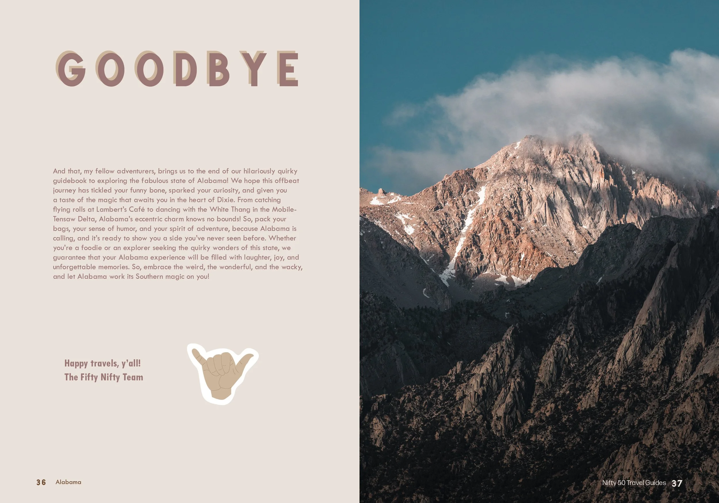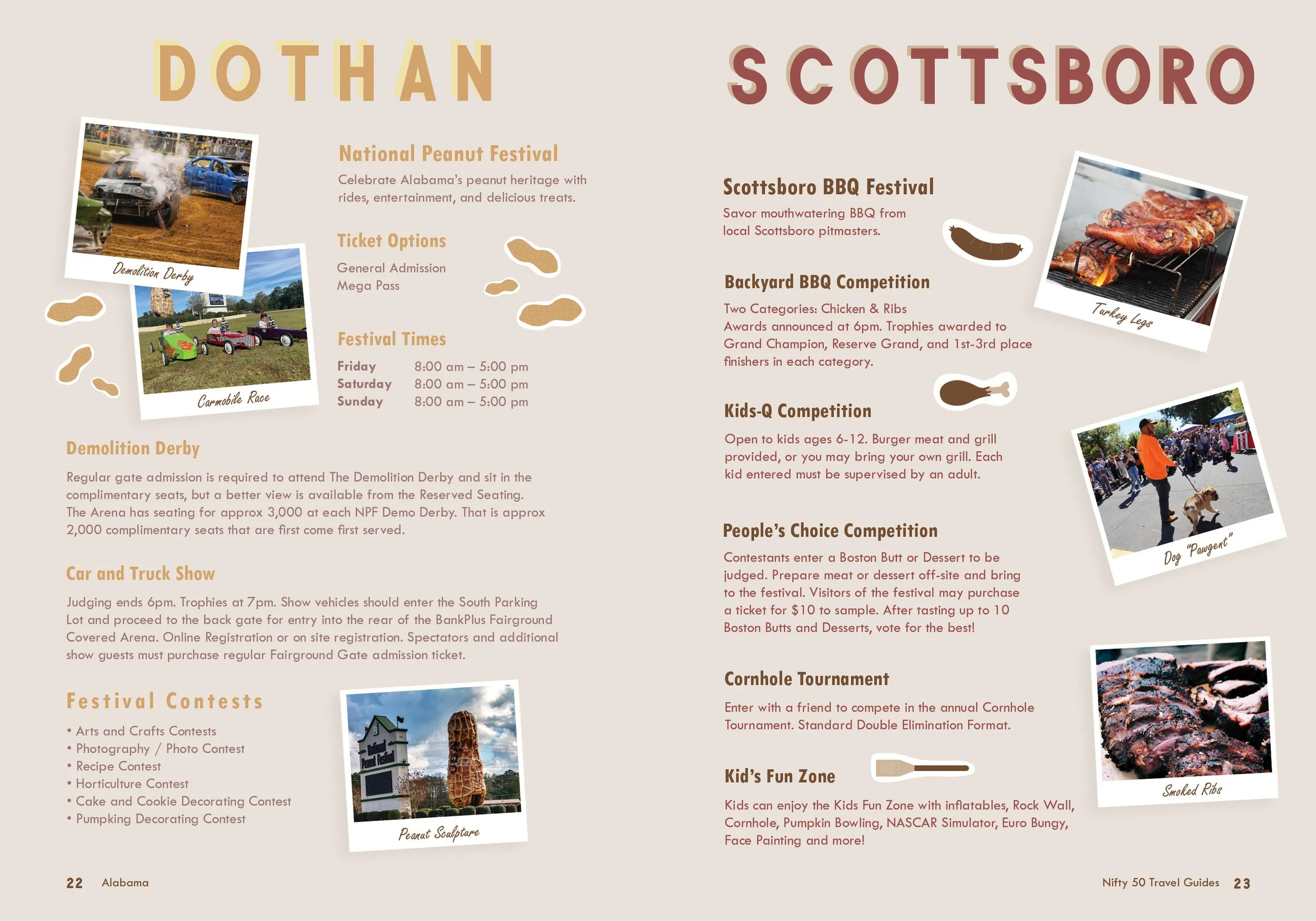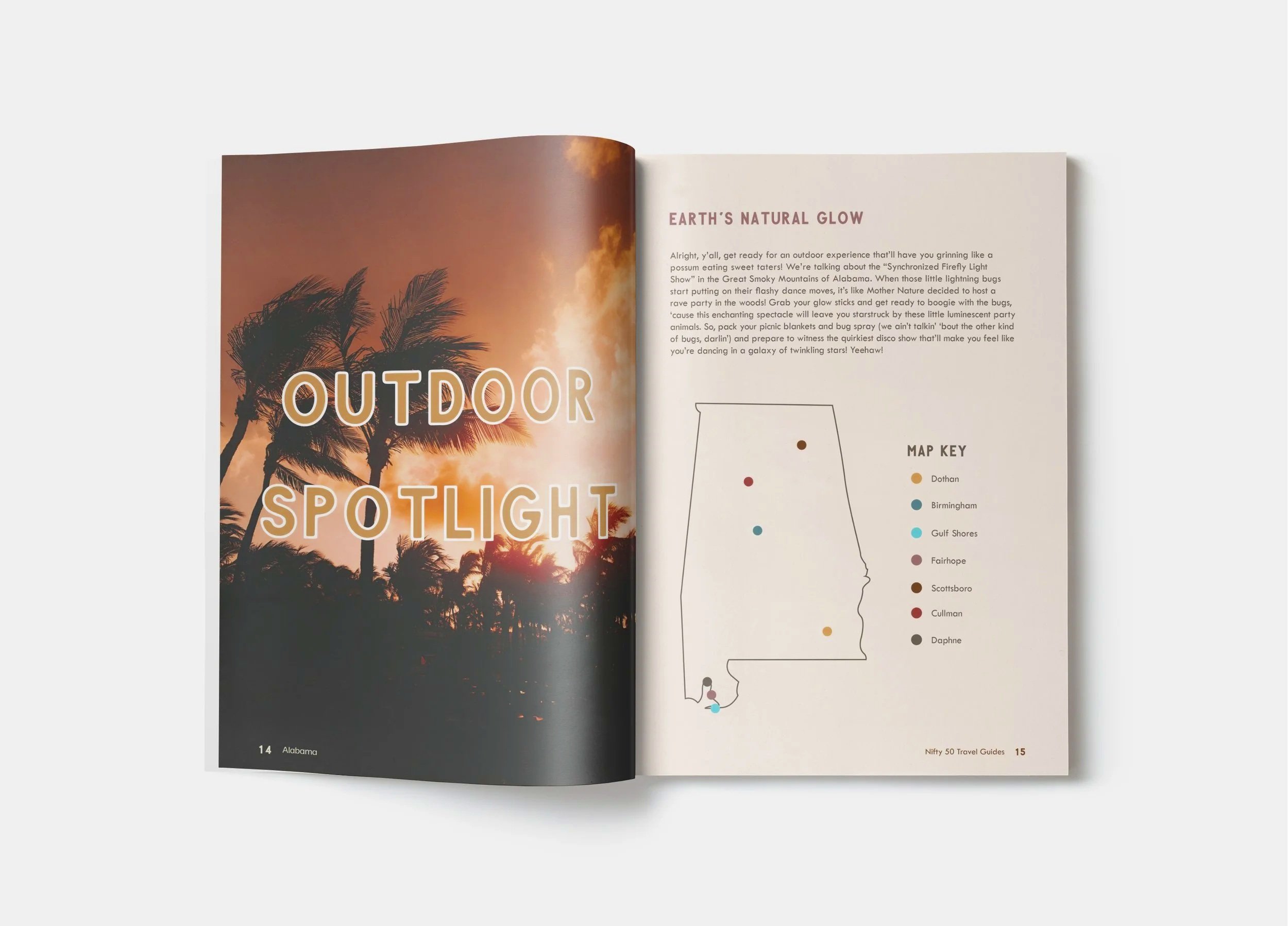 This project involved designing a fun, quirky travel guide for one of three states: Alabama, Idaho, or Vermont. I chose Alabama, as I had previously visited on a family trip and was familiar with several of the locations featured. While we were provided with base copy for the guide, I expanded upon it through additional research for each section and destination in order to create a more immersive and complete travel guide experience.