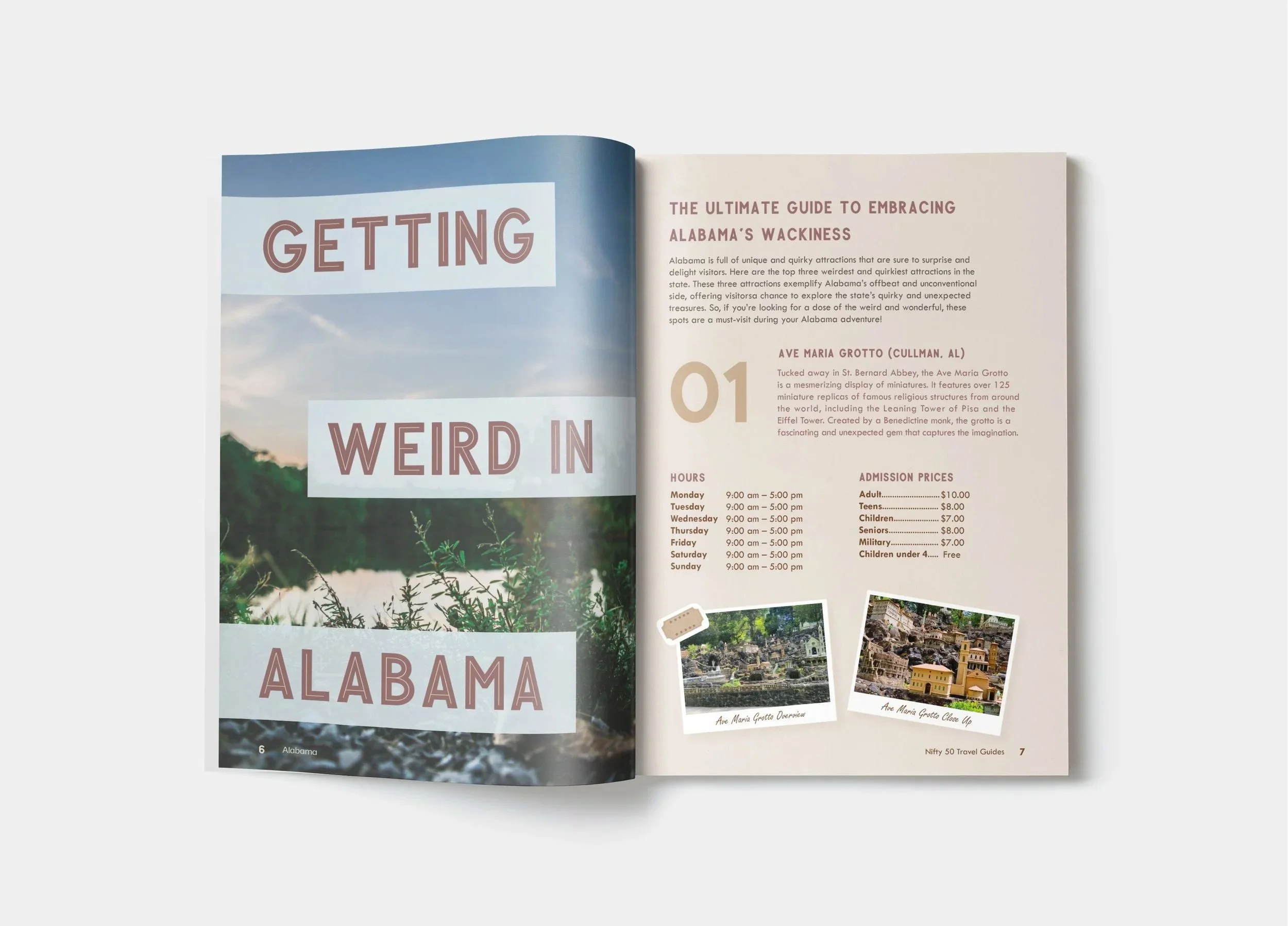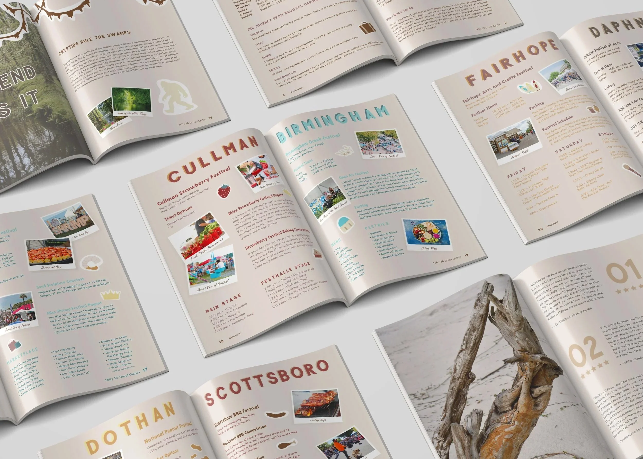 Inspired by my own experiences traveling to Alabama, the guide was designed to feel like a scrapbook of memories in progress. While base copy was provided, I expanded the content through additional research to create a more immersive and complete narrative.