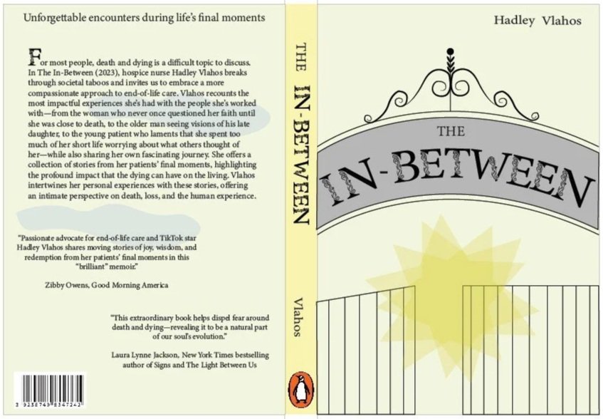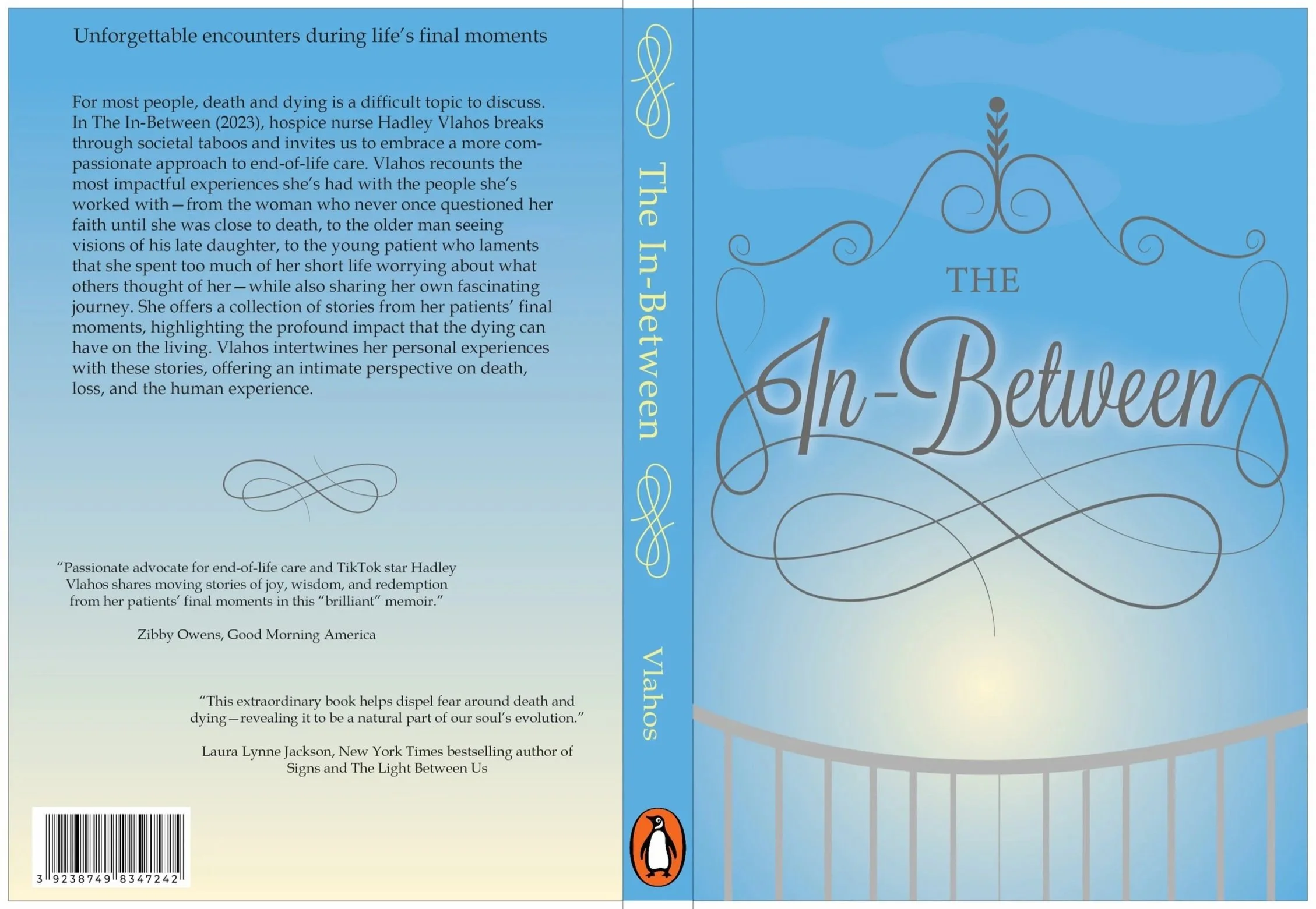 A soft sky gradient paired with delicate, flowing typography evokes transition, stillness, and reflection. Ornamental linework inspired by the gates to heaven symbolizes passage and connection, reinforcing themes of peace, empathy, and the space between life and what lies beyond.